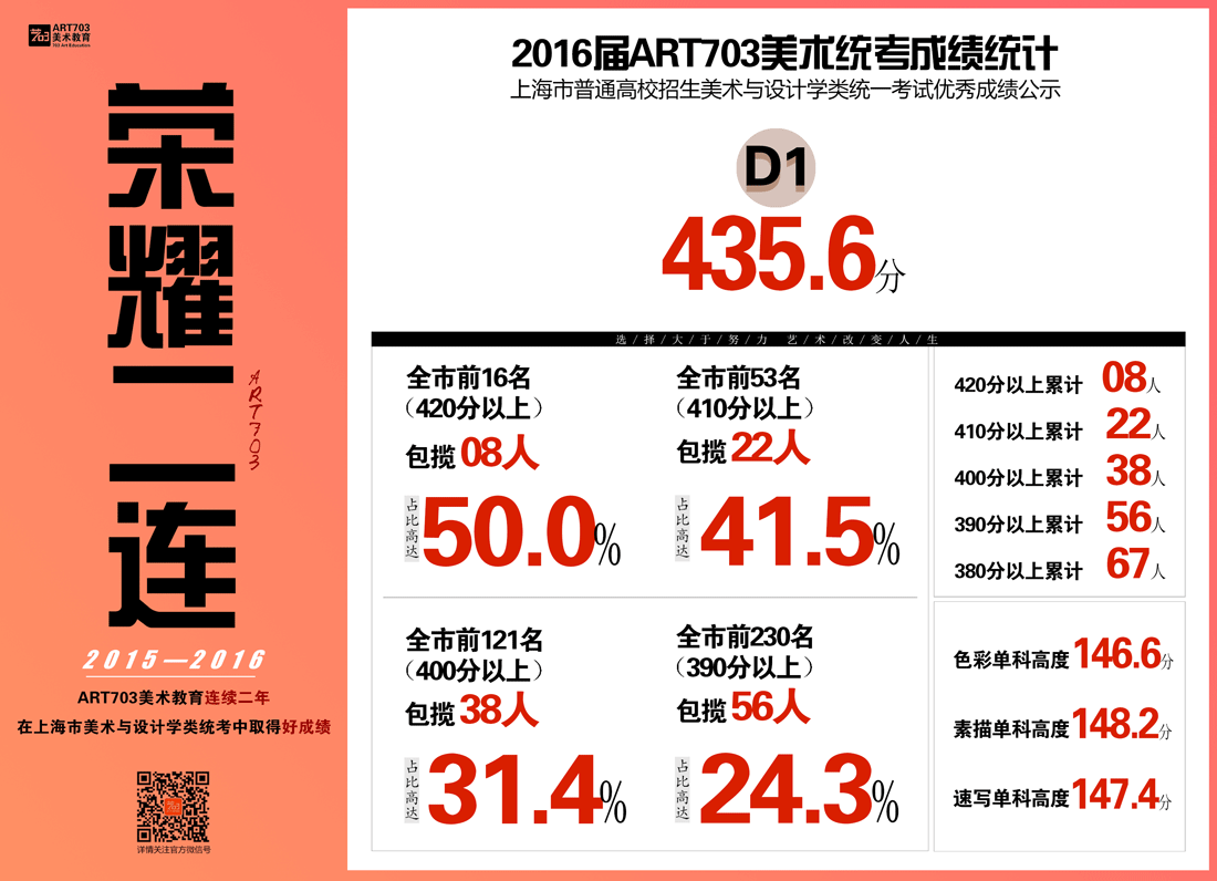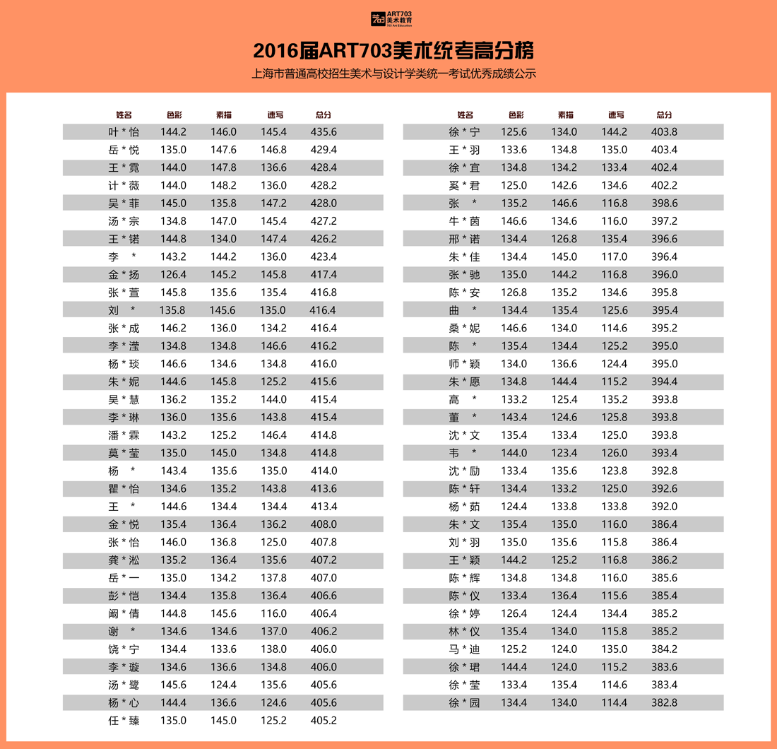 2、根据有关规定,保护学员个人隐私,姓名不完全公开,此分数(排名)不是以学生名义对我机构的证明,仅是对上海市普通高校招生美术与设计类专业统一考试成绩的采集展示,所涉学员均由ART703培训,全部数据客观真实,接受任何形式的查询。