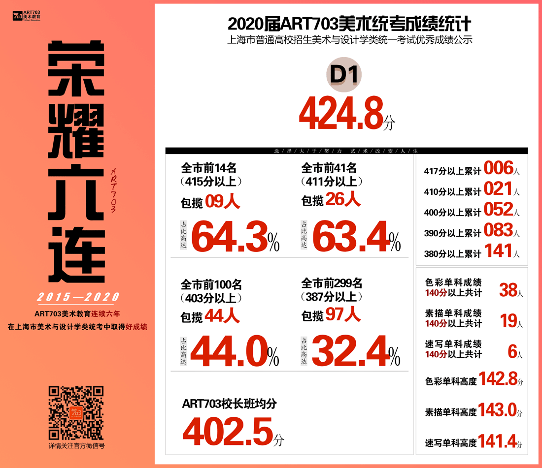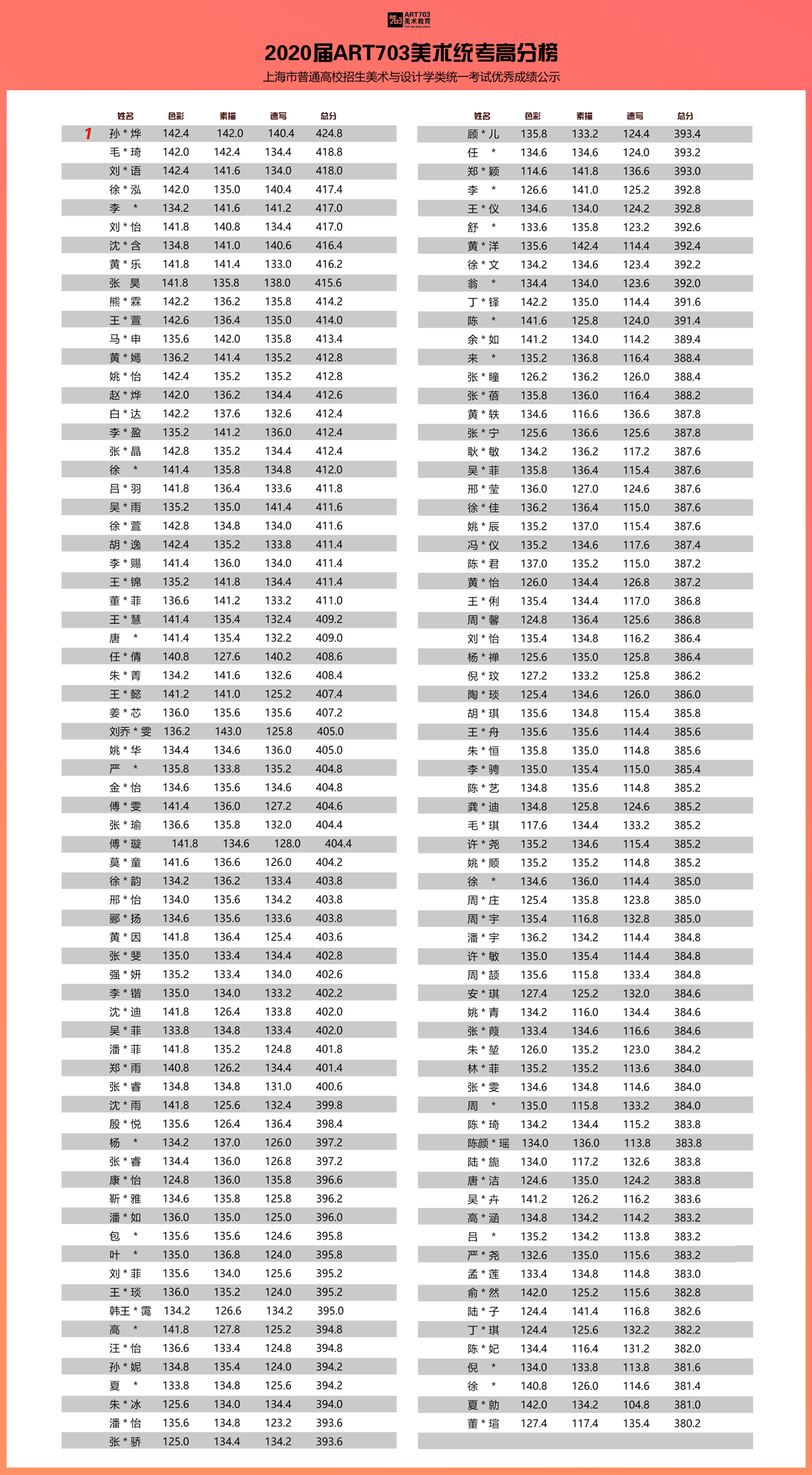 2、根据有关规定,保护学员个人隐私,姓名不完全公开,此分数(排名)不是以学生名义对我机构的证明,仅是对上海市普通高校招生美术与设计类专业统一考试成绩的采集展示,所涉学员均由ART703培训,全部数据客观真实,接受任何形式的查询。