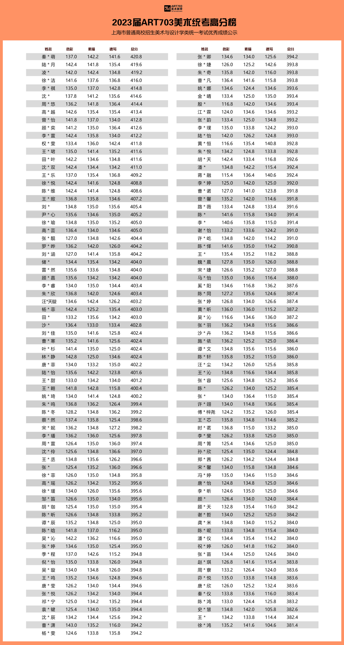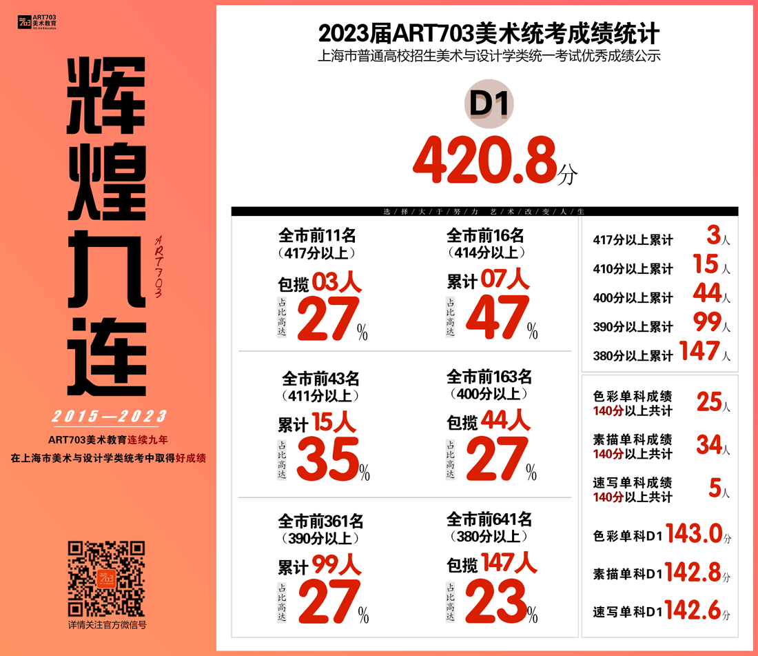 2、根据有关规定,保护学员个人隐私,姓名不完全公开,此分数(排名)不是以学生名义对我机构的证明,仅是对上海市普通高校招生美术与设计类专业统一考试成绩的采集展示,所涉学员均由ART703培训,全部数据客观真实,接受任何形式的查询。